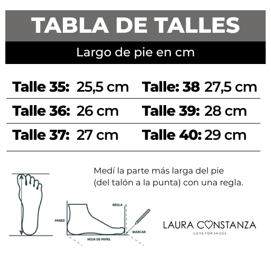 Cuidados: No mojar. No lavar. Evitar roces y golpes fuertes ya que se puede dañar o desgastar material. Evitar dejar expuesto el zapato por tiempo prolongado en el sol o luz porque puede aclarar el color.