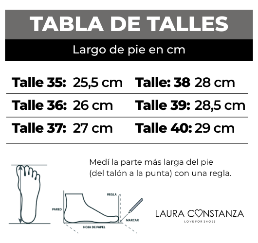 Cuidados: No mojar. No lavar. Evitar roces y golpes fuertes ya que se puede dañar o desgastar material. Evitar dejar expuesto el zapato por tiempo prolongado en el sol o luz porque puede aclarar el color.